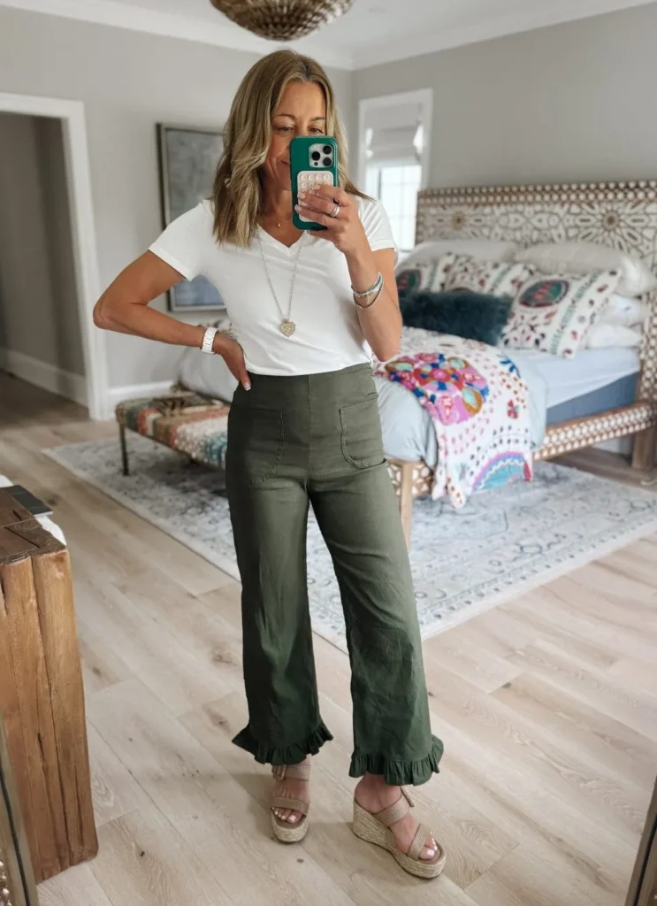 Proof that a white tee can do more than just keep it casual. Paired with wide-leg pants (hello, ruffle hem!) and platform sandals, this look is perfect for a casual workday, brunch with the girls, or anywhere you want to look pulled together without trying too hard. Comfort meets style with just the right amount of flair.