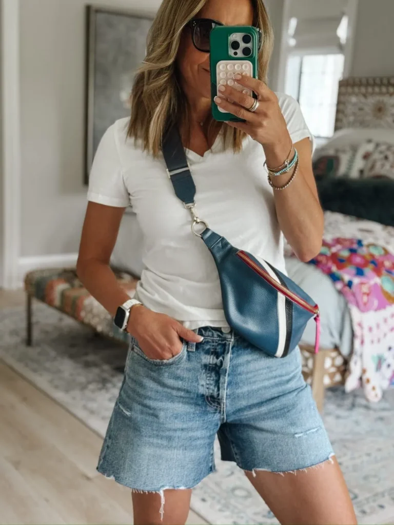 The white tee + denim shorts combo is the ultimate uniform for real-life summer. Whether you’re standing on the sidelines with a iced coffee in hand, running errands, or chasing kids through the sprinklers, this look checks all the boxes: comfy, cool, and classic. Just add sunglasses and your favorite slides, and you’re out the door in 30 seconds flat.