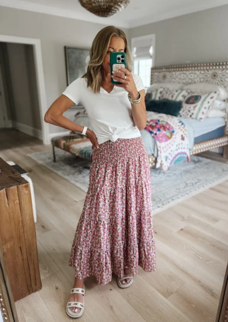 Not in the mood to tuck? Knot it instead. A simple twist in your white tee gives it a whole new vibe—effortlessly cool and flattering. Paired with a flowy floral maxi skirt and sandals, this look is made for summer concerts, backyard BBQs, or wandering through a farmers market with an iced coffee in hand.