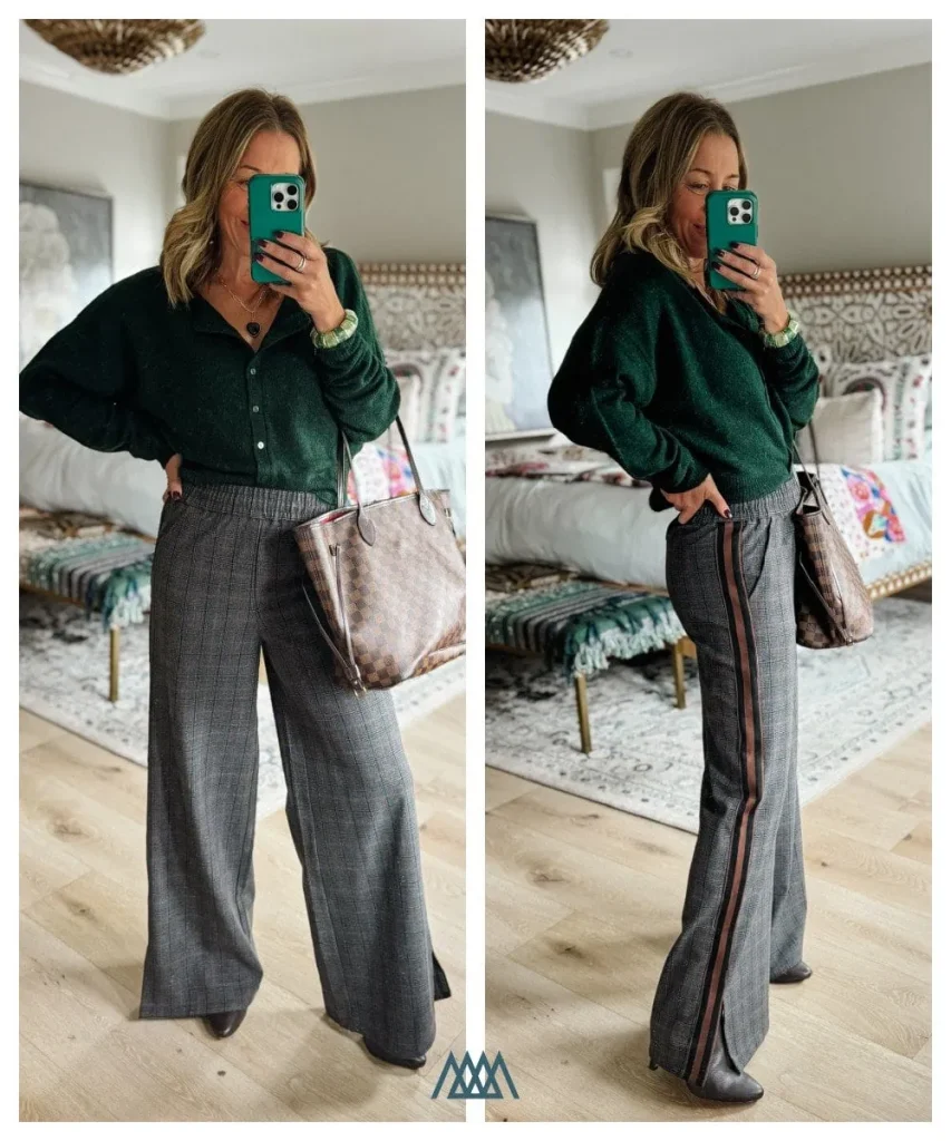 Workwear, but make it track pants. Yes, really. This look proves that the track pant trend isn’t just for gym runs and coffee runs—it’s also boardroom-ready. The tailored plaid elevates the sporty silhouette. Pair with flats or a heeled bootie to refine the look.