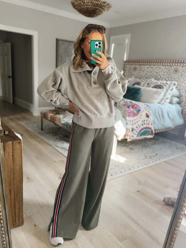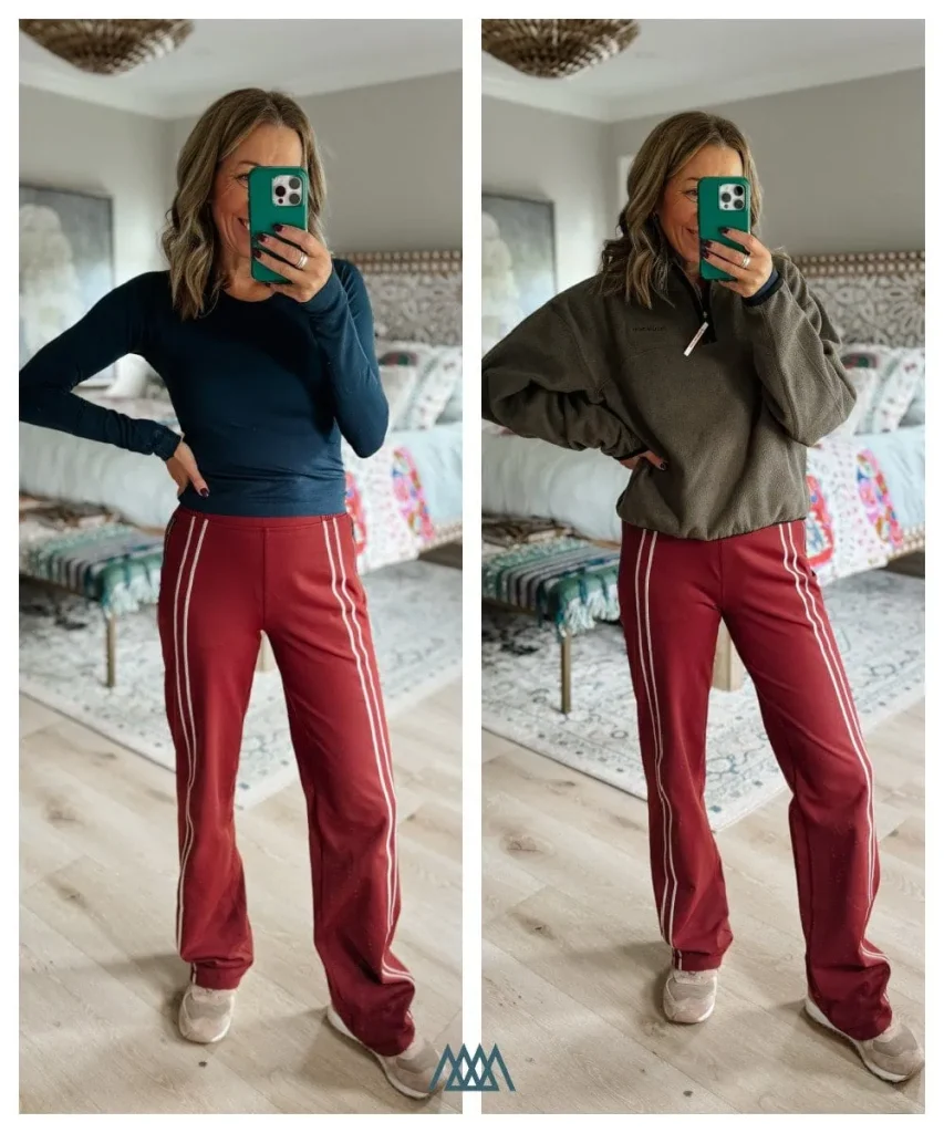 No, I’ve never really been a “ladies who lunch” type… unless you count power-walking the grocery aisles and meeting friends at the café section of Target. But lately? A quick bite and a little girl talk is my kind of therapy — especially when I’m wearing something cute. Enter the elevated track pant. These wine-colored beauties bring the sporty edge, while a two-fer sweater balance things out with a hint of prep. Add cool kicks, your favorite crossbody, and yes — suddenly you’re the effortlessly stylish friend who totally gets it. Pro tip: this look goes just as well with a latte as it does with a glass of wine. Your move.